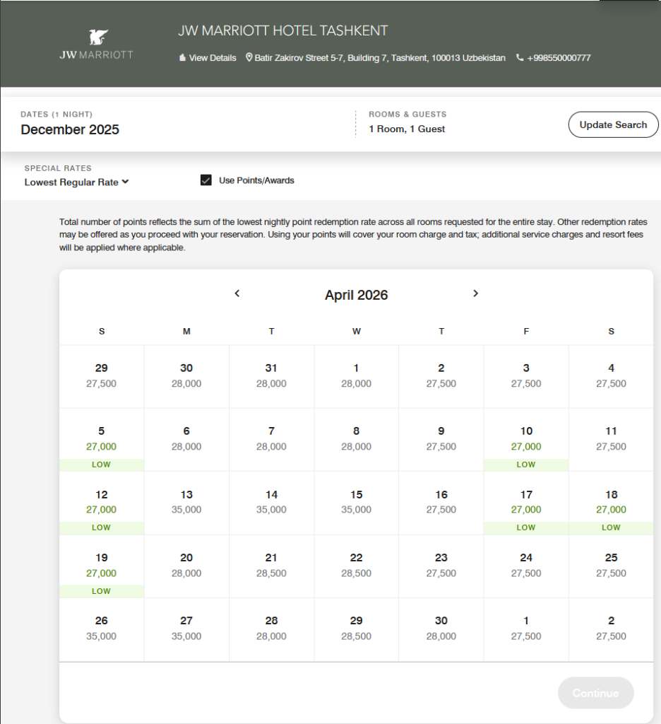 Prices in cash demands around $300+ minimum and can be more depending on the season. This is very expensive for Uzbekistan! But, with Marriott points, the rates become much more attractive. It’s a Category 3 hotel, making 35K Free Night Certificates very much guaranteed as redemption method.